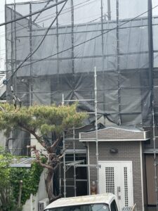塗装工事の最初の工程は高圧洗浄です。外壁に付着した汚れ・コケ・カビ・古い塗膜などを高圧の水流で徹底的に洗い落とします。この下地処理を丁寧に行うかどうかが、塗料の密着性と仕上がりの美しさを大きく左右します。
